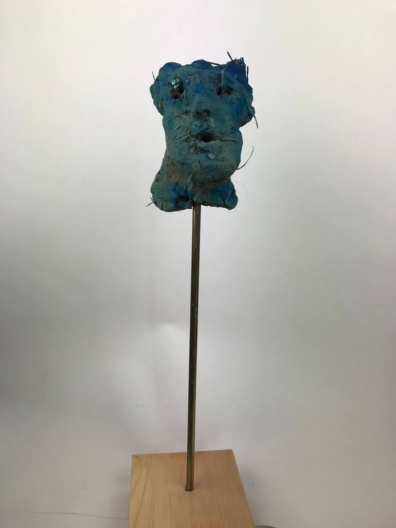 Scultura astratta di volto dipinto con pigmenti blu. L'opera è realizzata in terra cruda con paglia, sabbia, segatura, legno e altre fibre vegetali. Questo lavoro vuole rappresentare il gesto primitivo del creare con elementi naturali sempre esistiti.