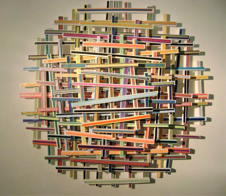 made from 100 pvc slats and hundreds of paper strips a unique cross hatched wall sculpture.very intricate/great depth and shadows.
