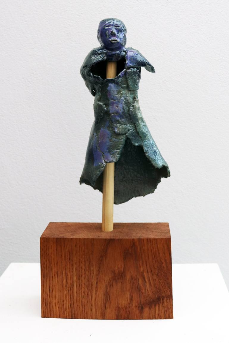 Ceramic sculpture of a warrior with an oak stand. Created in paper clay and blue glazed and fired twice in an electric kiln. Glazed at 1250° c.