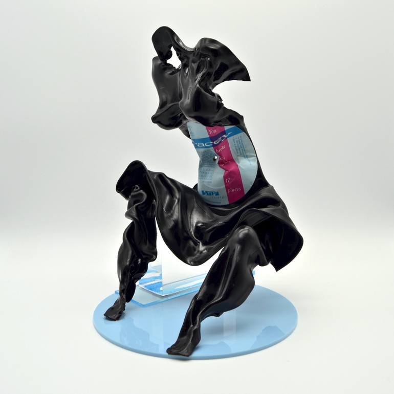 Sculptures created from whole vinyl music records... nothing added and nothing removed from the original material. The abstract, figurative forms are organic in their conception, with the vinyl having a life of its own upon heating. I pair the final sculptures with modern, geometric materials such as perspex and acrylic - the hard solids contrasting with the solidified, liquid lava appearance of the vinyl. The figures recline, dance and become caught in a movement that was previously evoked from the playing of the records themselves.
