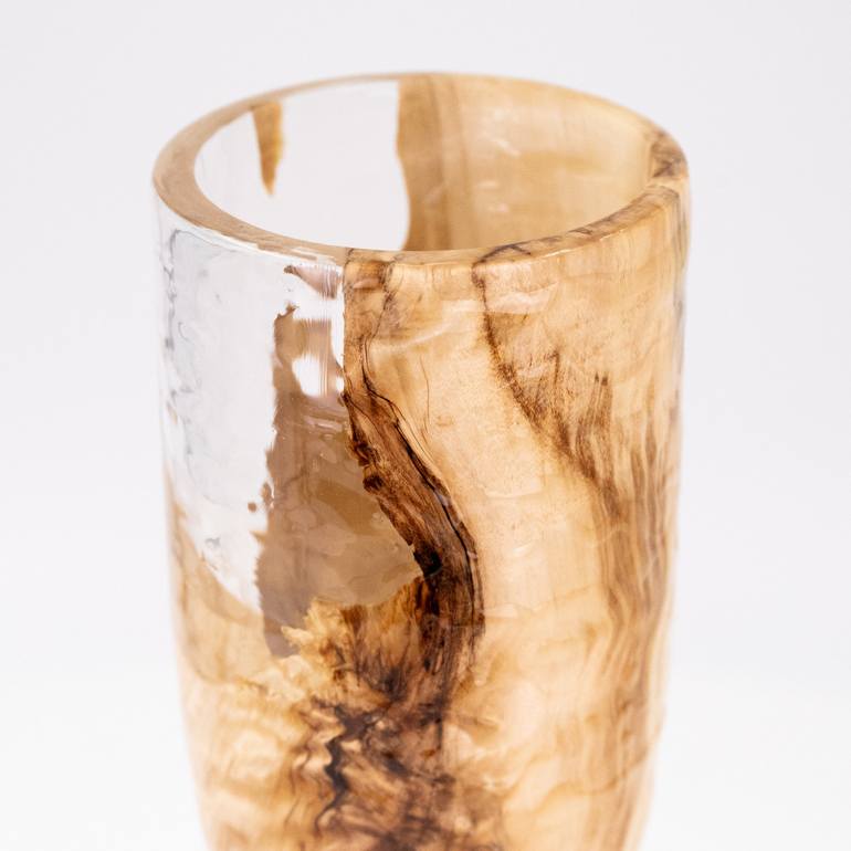 This is a stunning piece of wood art, hand-turned from a piece of quilted Lodgepole Pine, with the voids filled with clear epoxy resin. It is difficult to see in the pictures, but it has a unique finish with beaded-up epoxy that looks like water droplets. Absolutely stunning and no other artist is p...
