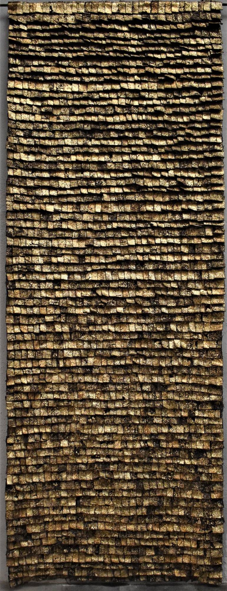 This work is created from the deconstruction and re-contextualising of antique textiles. It has been created methodically from over two thousand pieces of fabric that have each been hand cut, gilded with gold leaf* and then stitched together. The gilded pieces have then been stitched to a canvas bas...