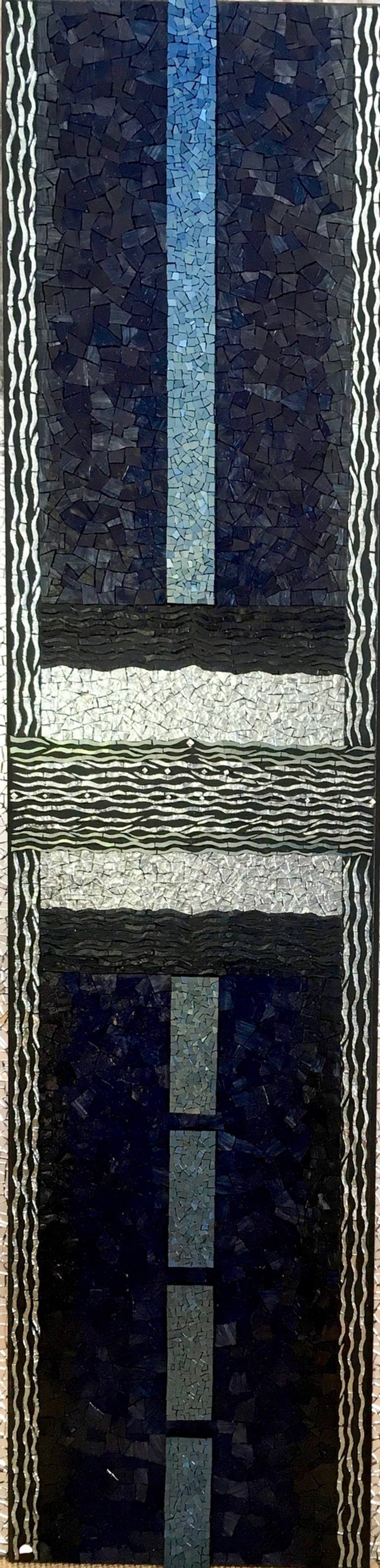 The artist visits Venice every year to choose her materials from the famous factory called Orsoni. One year (2019) the city experienced extraordinary flooding (Aqua Alta), the rains poured too and the city became a watery paradise of luminosity. Marterials: Indigo glass smalti (specialized mosaic g...
