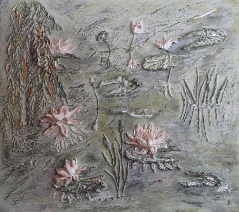 This artwork, created using a mixed-media technique, combines plaster, sand, and acrylic to achieve a unique three-dimensional effect. It depicts an aquatic world where lilies, reeds, and graceful willow leaves intertwine in natural harmony. Each element of the piece is meticulously handcrafted, mak...