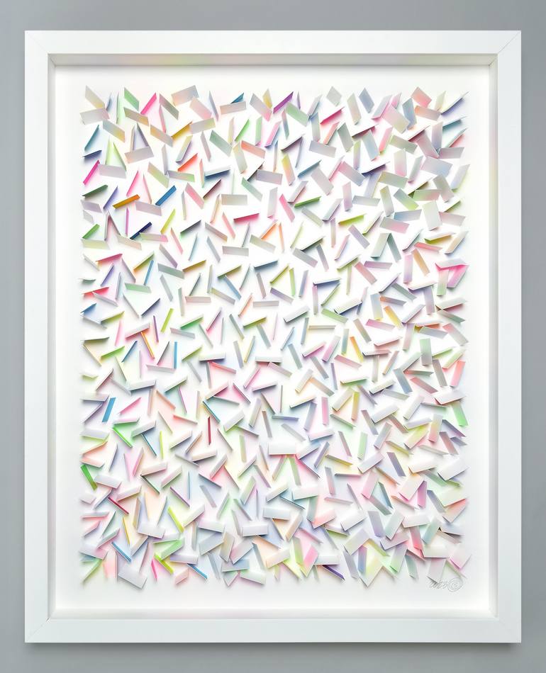 Olga's artwork is a stunning exploration of color and shape that showcases a strong rhythmic connection between space and form. The artwork is composed of rectangles arranged in a chaotic order, with each rectangle connected to the surface at different angles. The white surface of the artwork adapt...