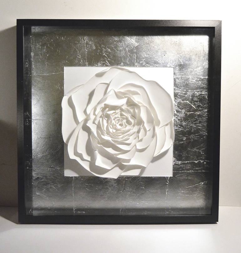 A single white rose form rests on an armored silver leaf matte under glass. This seemingly delicate sculpture is deceptively durable; it is a waterproof, tear-proof, tree-free synthetic paper material, hardened into a bony white form with heat. It may look light and fragile, but it's quite strong. ...