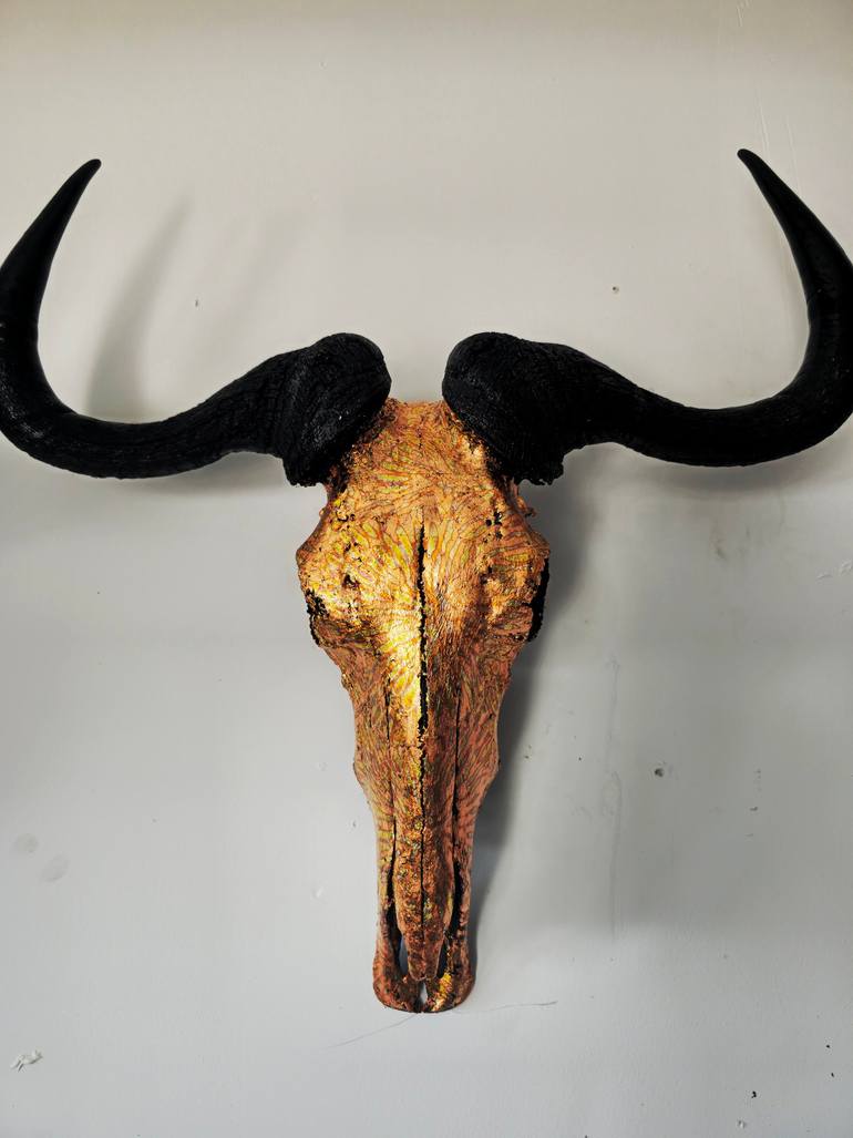 Wildebeest Skull -- Orange Sunburst Variegated Gold Leafed Sculpture