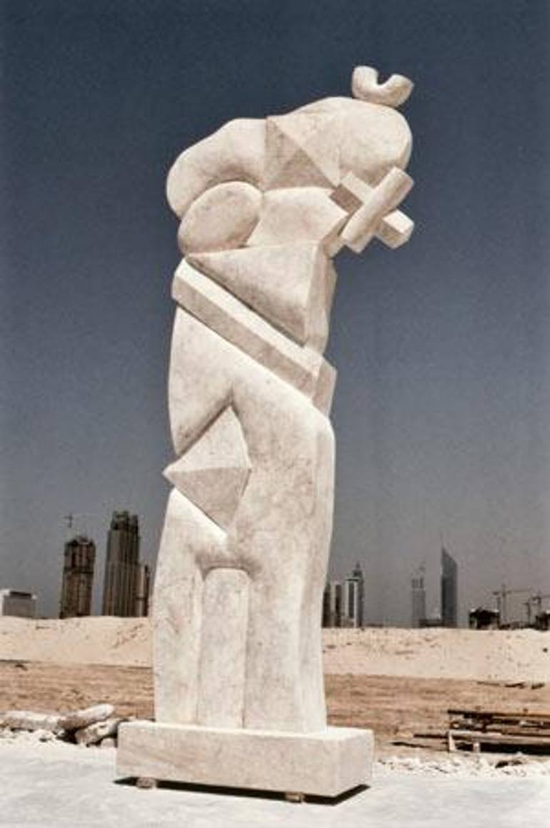 He makes dynamic, floating forms in coloured marble which appear to defy gravity.His style is semi-abstract and symbolic- "I believe an artistic environment should be not so much realistic as poetic".