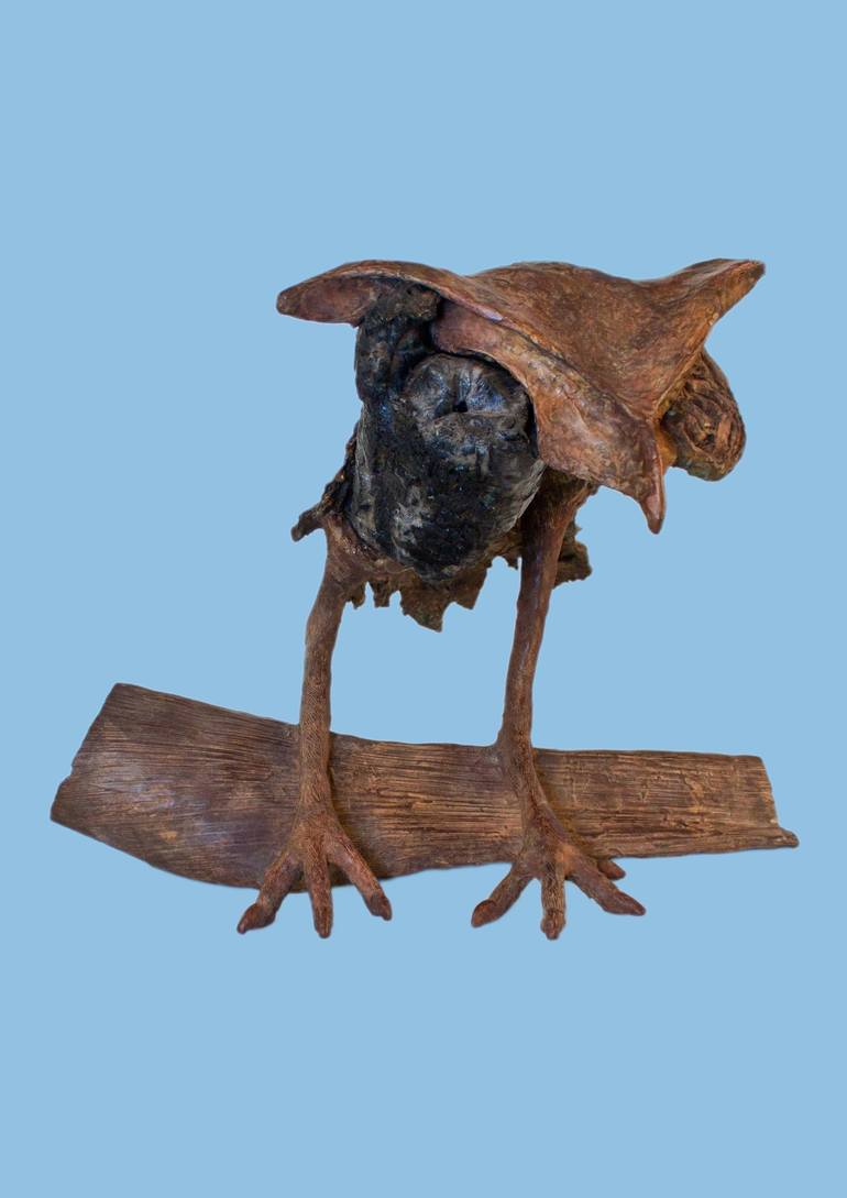 This wise owl is part of The Menagerie - a series of unique, one-of-a-kind animals and creatures sculpted out of wood, bronze, metals and epoxy clay. The left eye is a found piece of burnt wood and the entire body and base are made of bronze.