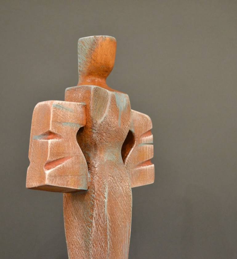 The sculpture "Woman," which I also call "Majka Makedonija" (Mother Macedonia) is inspired by the traditional costumes, dances, art, and artifacts of my home country. It combines historical and archeological motifs with a modern style. The sculpture is carved in wood, with a patina of white and bl...
