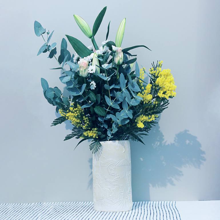 Ceramic vase with an embossed illustration on the front. It is a relief print on white chamotte clay coated with white enamel inside and out. Variation in shade from white to cream. The vase is waterproof and can accommodate bouquets or other decorations. The art object is signed on the base.