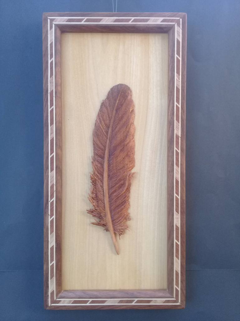 I like to work with wood. The wood gives you many possibilities to do something from very big to something very fine. This feather is made from maple wood and sealed with natural oil. The base is from poplar and covered with shellac. The frame is made from teak wood with wooden inlay and sealed.