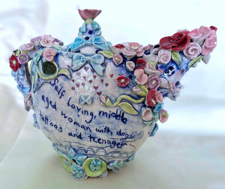 Highly decorated ceramic teapot, with flowers, bows and vines. It is deliberately non functional, the spout has flowers growing over it and the handle is too small and uncomfortable to hold, also covered in flowers. The lid doesn't quite fit properly and has gold leaf highlights on the flower tips. ...