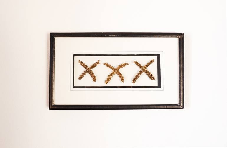 Grain ears of bronze in the form of three x, closed in an old cabinet behind glass.
