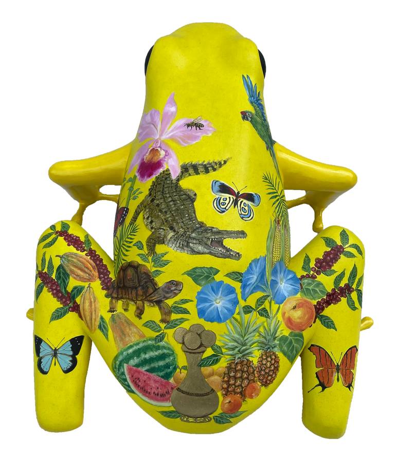 This sculpture is inspired by the famous most poisonous frog on the planet: Phyllobates terribilis, also known as the golden frog. This species lives in the jungles of Colombia, specifically in Choco. This work of art is part of the series: Colombia: Paraiso de Colores, which is made up of the 3 fro...