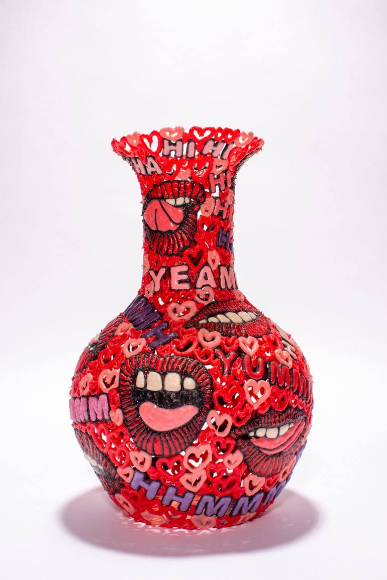 Adorned with depictions of lips and mouths, each curve and contour tells a story of sensual longing and whispered secrets of passion and desire. The interplay of light and shadow accentuates the vase's sculptural beauty, evoking a sense of movement and depth that captivates the imagination. This Y...