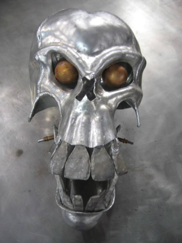 A terror from Outer Space or Hell...? He Crawled and Clawed from deep in my Mind into my Hammer Swinging Hands. He is Tuff and Mean. Sturdy and Hard. From a rough Sketch Lay out I hand Hammered .100 thick 3003 H14 Aluminum Sheet into close shapes. Then Gas and TIG welded them into features I was P...