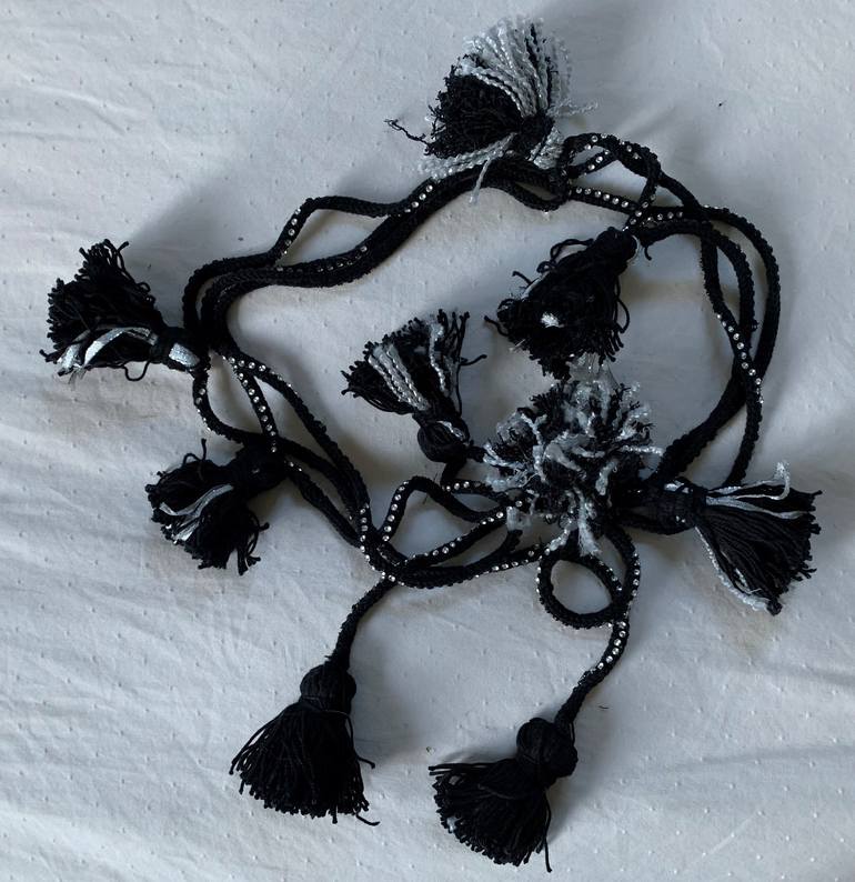 This necklace was created for a show called, "Zap." I wanted something fun to wear that is also as exciting as the sound of lightning and thunder. It is cotton and rayon with some wired yarn