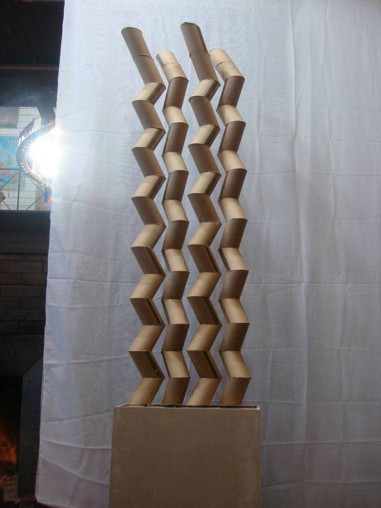Four zigzag cylinders that rotate in opposite directions to the neighboring ones. It seems that the structure should collapse, but the cylinders rotate without touching each other. The rotation mechanism is located inside the base. This object is in the collection of the State Russian Museum (Russia...