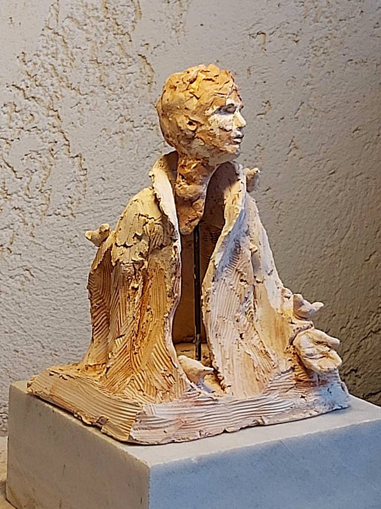 it is a surrealistic image of a composition executed in clay and turned to a ceramic is an image of a child trapped in his psychic traumas trying vainly to escape but instead becomes the home of birds ,the living creature that can travel this way the little birds become his vehicle to freedom .