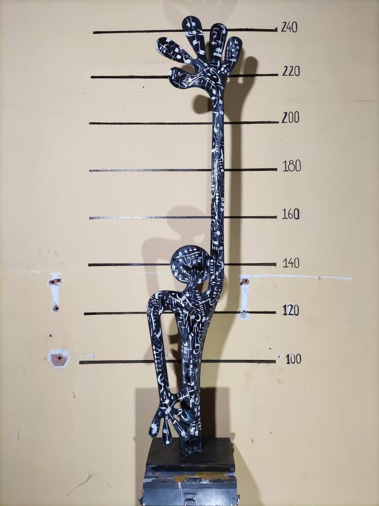 This work is created using my main artistic language. His gesture is a reaffirmation, a here I am. Its skin is made of synthetic enamel, where the colors and pictorial details make it a unique skin. Created in stainless steel and enamel