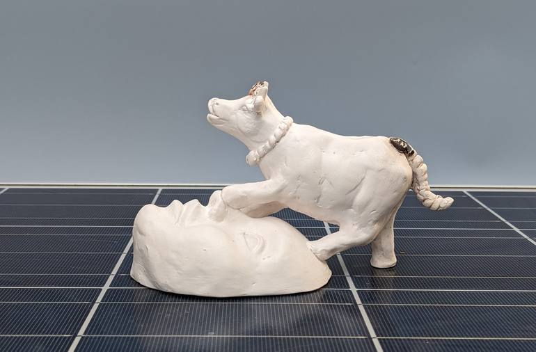 A decorated cow with a ribbon on a curling tail, a flower between her horns and an ornament on the neck, puts her foot down as if about to climb a small hill made of a human face. The image represents a reversal between the human and the animal and between nature and man. In the 'cows' series I pla...