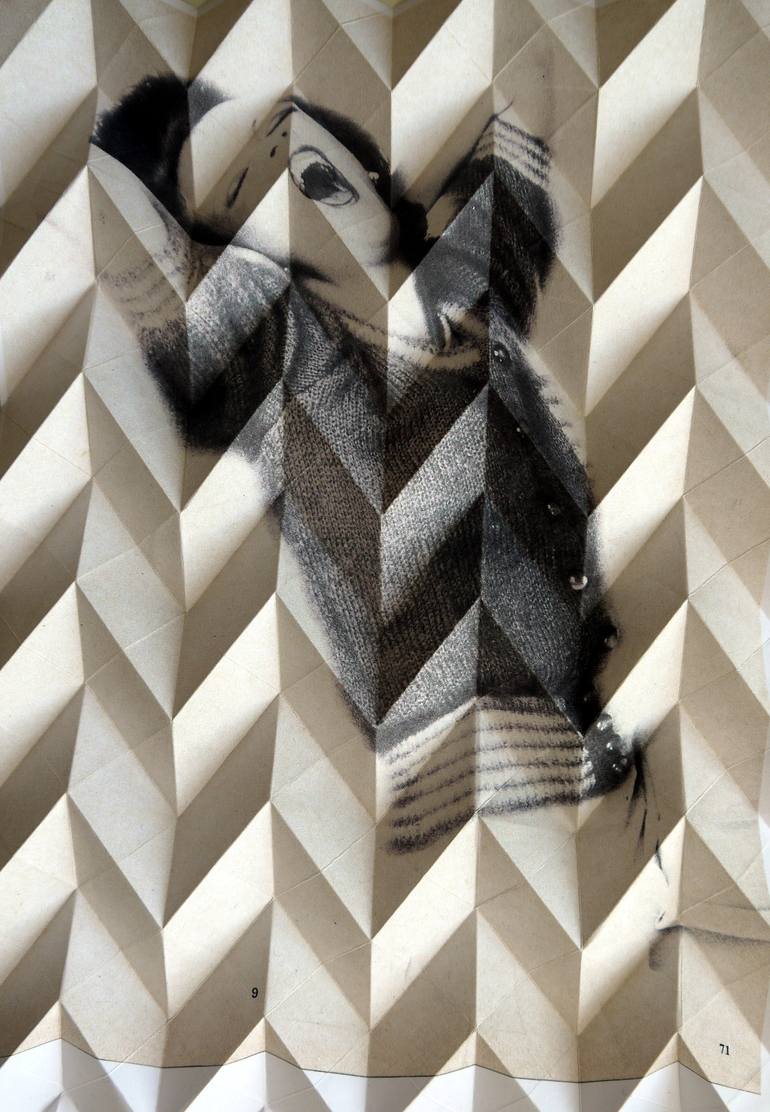 3D folded paper image of a woman in a green jumper (except its in black and white), framed and glazed, deep limed wood box frame, dimensions 40x30x4.5cm