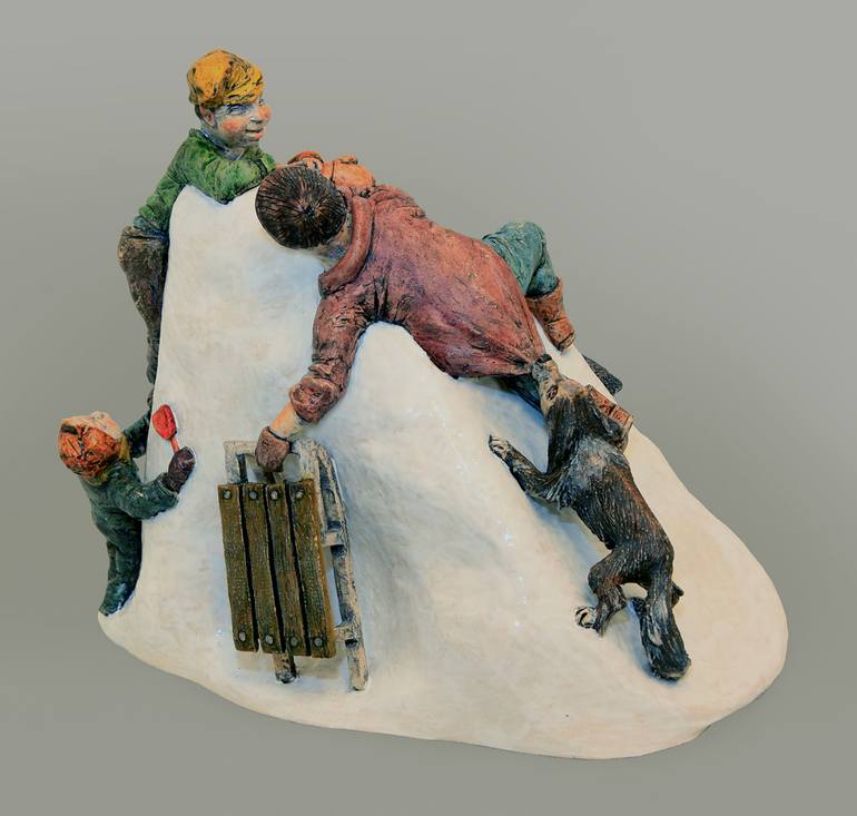 Children enjoy winter. Hot red faces on a cold and white snow. Materials: high temperature clay, metal oxides, glaze, 3 times burning