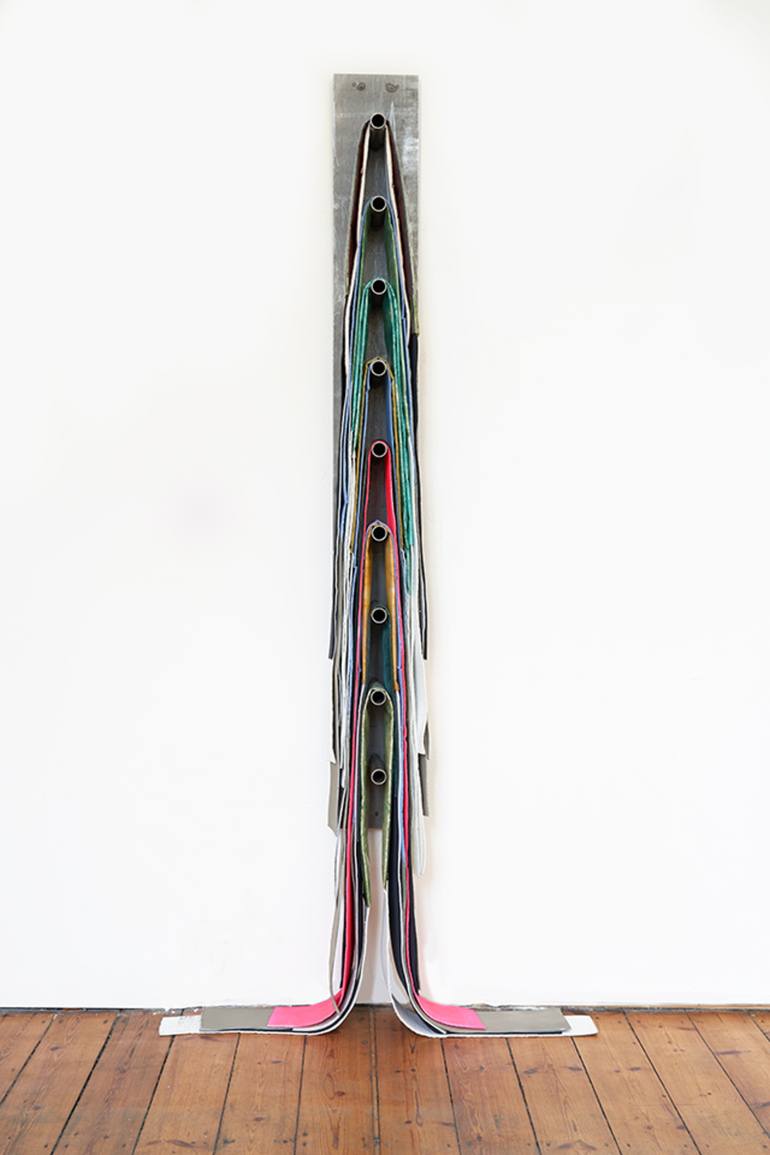 Three-dimensional object consisting of colored fabrics and colored foils. It is possible to re-lay the ribbons, so the object can change continuously. The work was conceived for an interactive exhibition in which the visitors tied the ribbons as a pair around the body. Constricted, they visited the ...