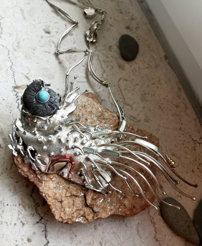 Подвеска выполнеиз серебра 925.Техника исполнения гнутье, пайка, полировка, матовка, глухая закрепка. Тему произведения навеяло незабываемые впечатления от морских обитателей, хотелось передать фактуру и краски подводного мира в серебре, подчеркнув перламутром, бирюзой, цирконами и старой ракушкой.