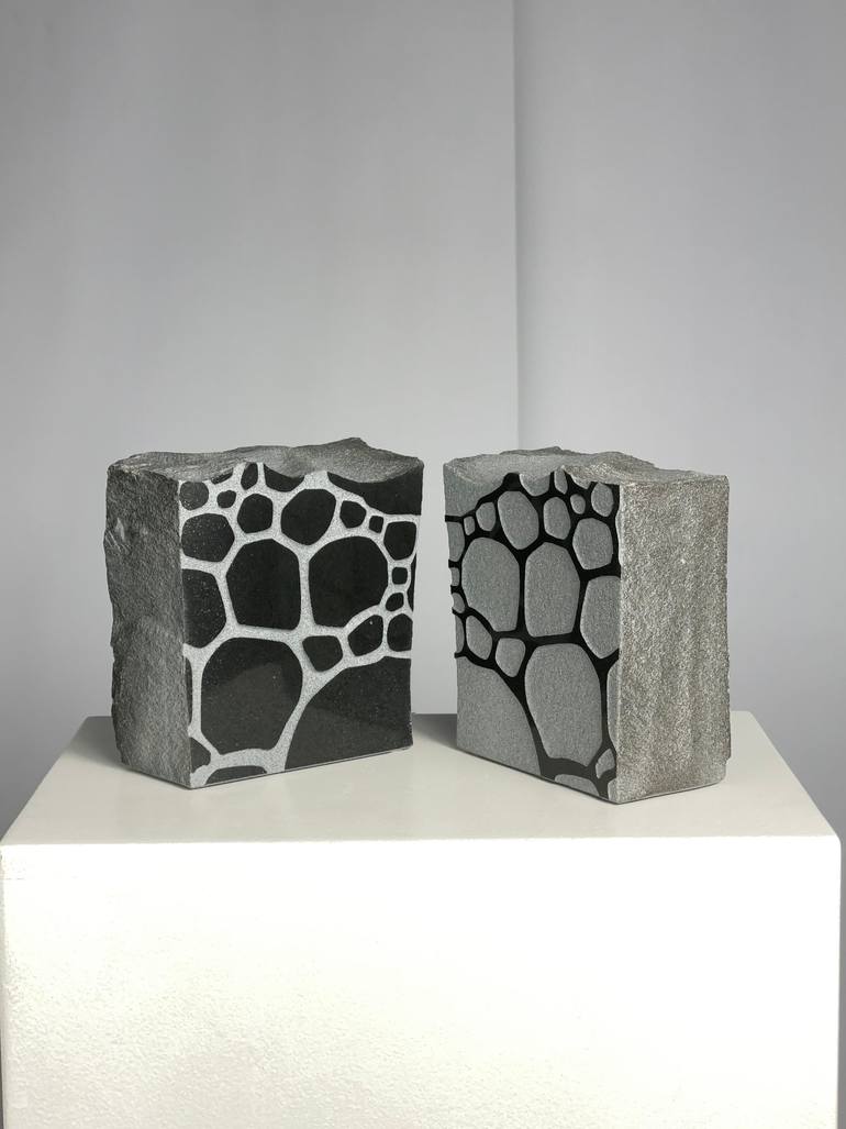 The stone is split and the cut surfaces are polished. Positive and negative forms and structures are worked into these surfaces, which when pushed together reconnect to form the original surface and can be combined to form the original form.