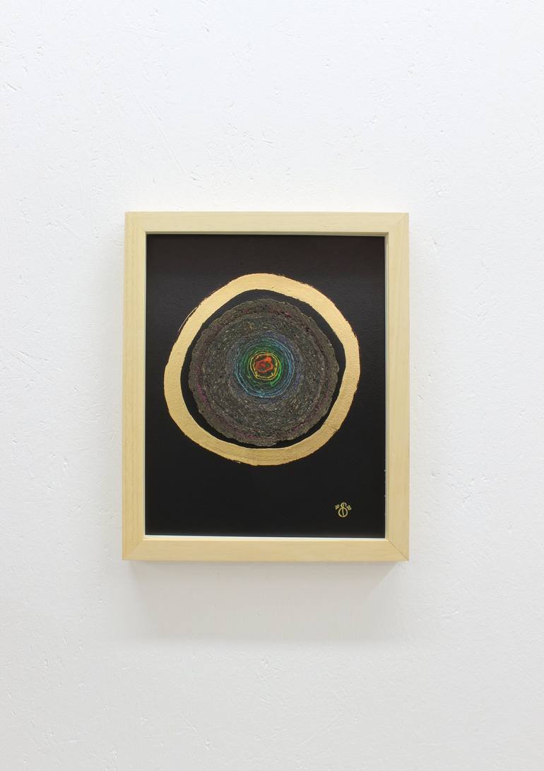 Here you can see an individual interpretation of a moon rainbow or the colors of that represented in the form of a "tree slice" combined with gold leaf (Dukaten-Doppelgold 23 Karat). The artist tries to return wood residues, such as wood shavings and sawdust, back to their original form, the tree,...