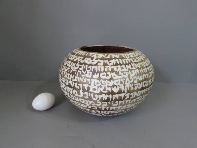 hand built ceramic bowl, organic rounded shape, raku fired. Hebrew letters decoration. stoneware vessel ,unique piece.