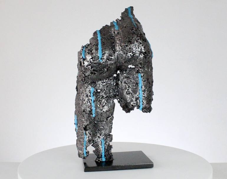 Artwork representing a buttock in steel lace and fluorescent blue pigments. This sculpture was created by dripping, by melting steel drop by drop. Fluorescent blue pigment drips symbolize raindrops. The blue pigments are charged with UV rays and become fluorescent in the dark. Steel base 3,94 x 5,51...
