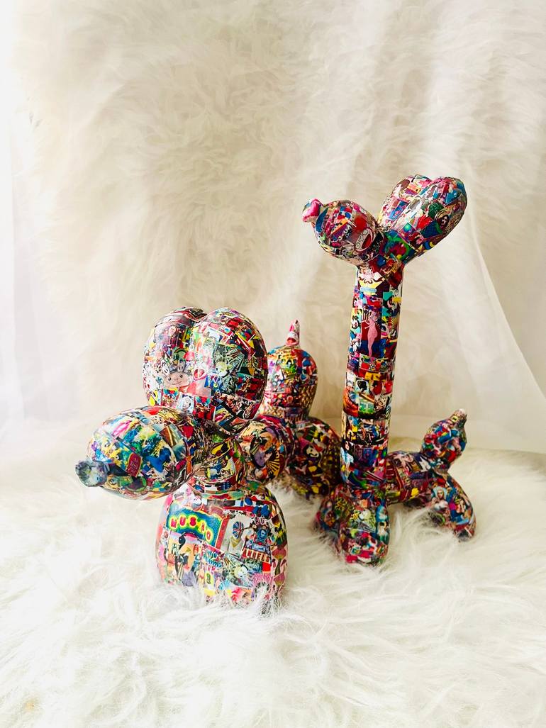 a duo of balloon dog sculptures that redefine the boundaries of contemporary creativity. Drawing inspiration from the renowned Jeff Koons, these sculptures offer a fresh interpretation infused with the visionary collage work of Tadanori Yokoo and the dynamic photography of David LaChapelle. The fir...