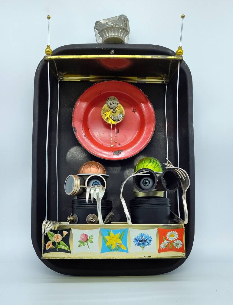 This contemporary wall sculpture is a one-of-a-kind piece, uniquely crafted from vintage and upcycled objects like an old bread pan, enamel red plate, pocket clock mechanism, and colorful antique tin box. Inspired by a whimsical robot couple on a theatre balcony, this eclectic artwork showcases a ch...