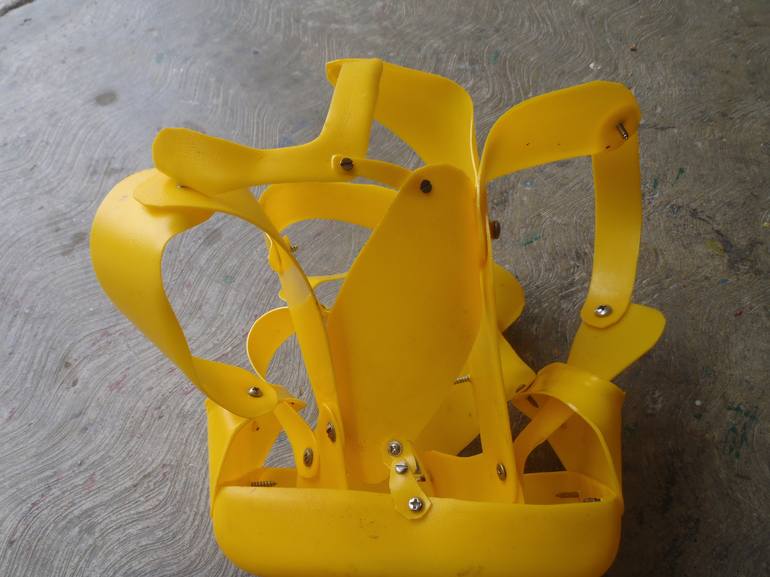 abstract expresionist sculpture made from a one gallon cannister of engine colant