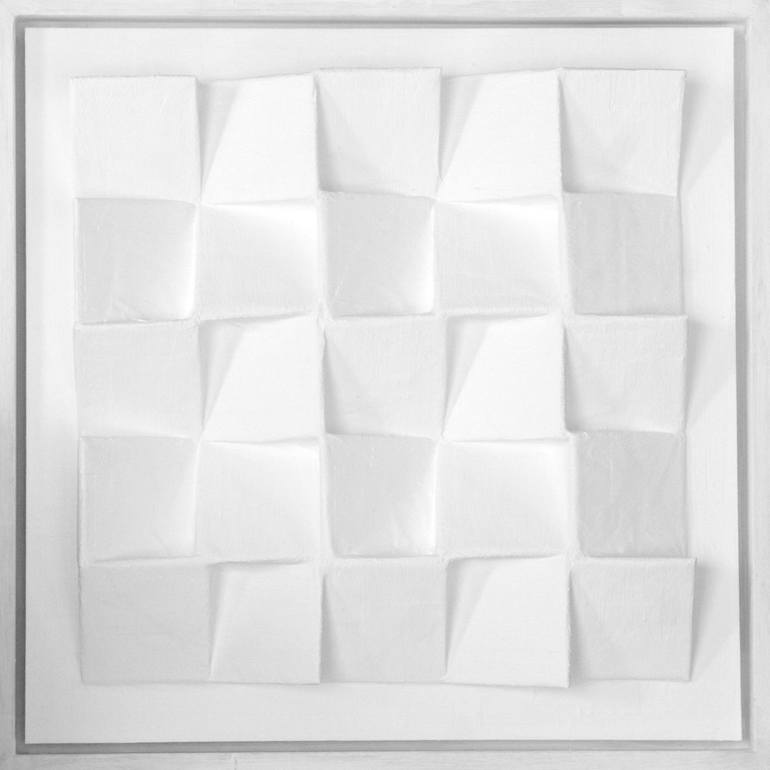 ready to hang, geometrical-abstract relief, reminding of the Stijl and Zero, quiet, spiritual and meditative, patiently composed and constructed from art board and paper elements, catching the light from different points of view and throughout different moments of the day. comes with a signed certif...
