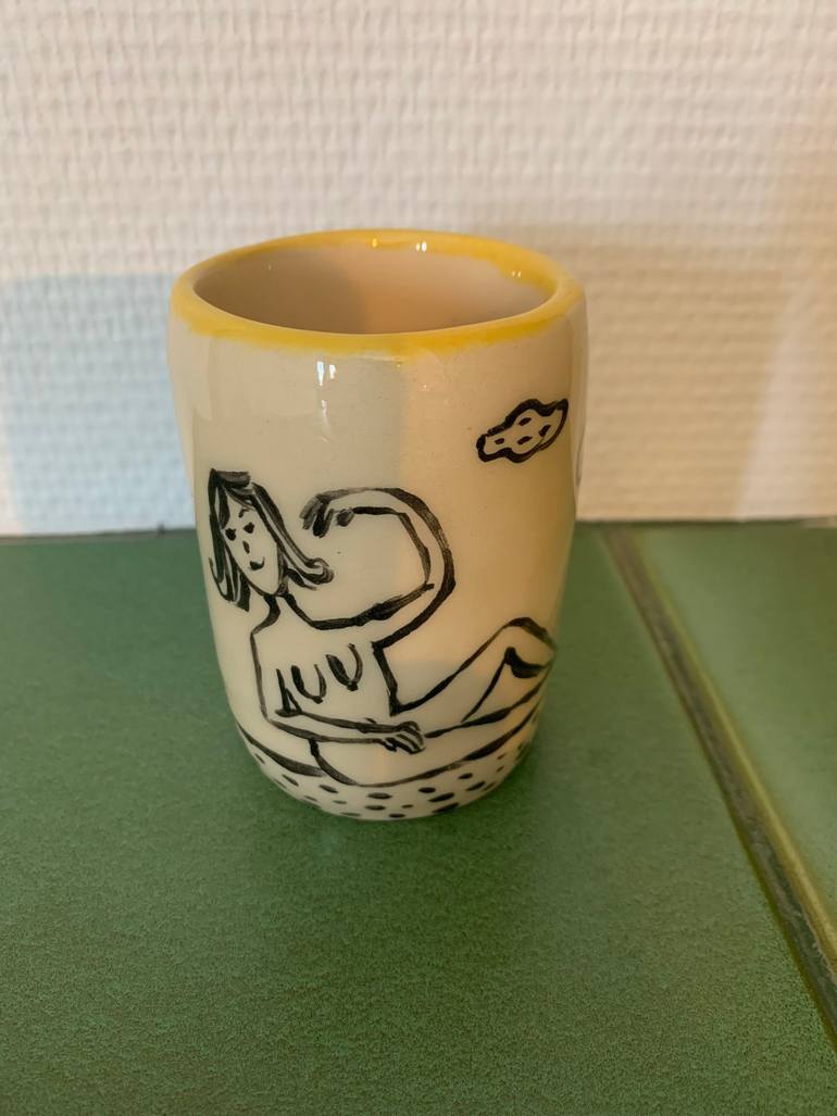 It is a unique glass or vase. A woman drawing on it. Black line contour drawings, it is funny and special.