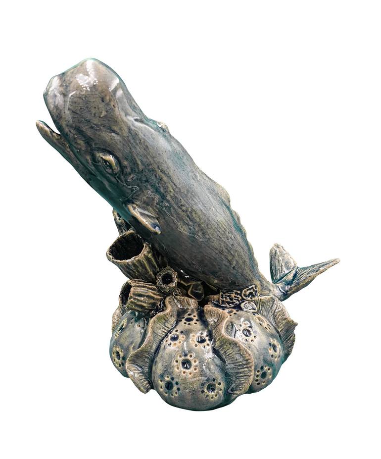 inspired with sea life. A realistic sperm whale with corals on a sea-urchin. it was sculpted by hand with white clay (%40 chamotte). it was glazed with tranculent crackle glaze.