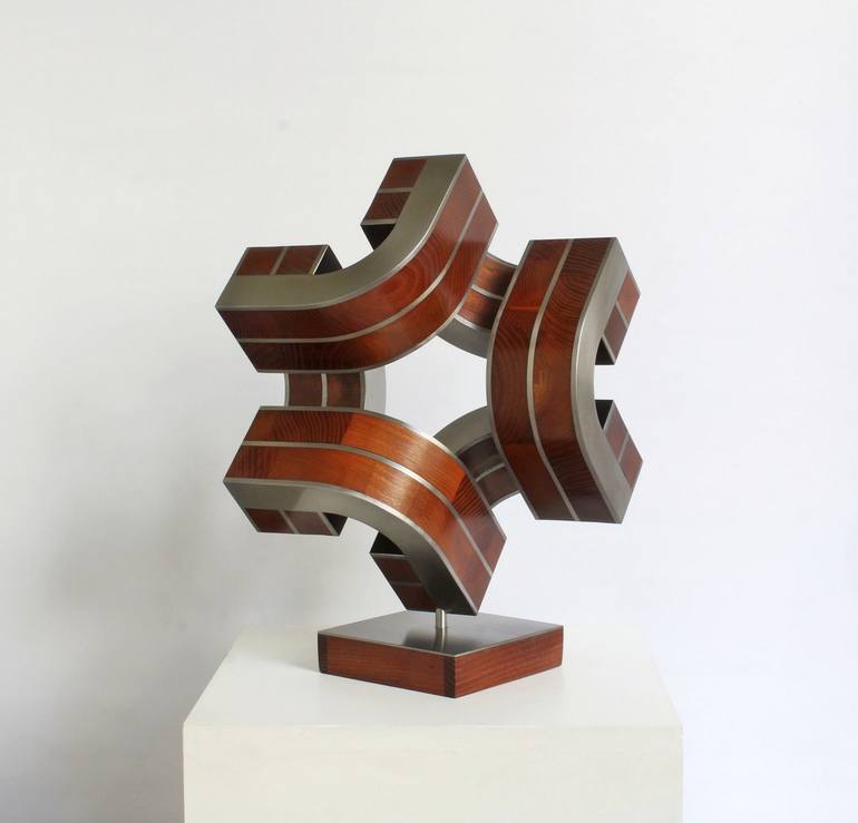 Nikolaus Weiler is a contemporary German sculptor. He lives and works in his studio in Berlin since 1994. In his work, he focuses on the representation of space and body from all perspectives with the aim of creating an objective sculpture in the field of tension between dynamics, movement, rhythm and change. The sculptures are made of metal and wood. The sheets of stainless steel, aluminum or steel are cut and bent into shape and then firmly attached to the wood. This allows their properties to complement and stabilize each other. The all-dimensional sculptures are a special group of works. They are created in a constructive development process in which spaces and bodies expand in all directions, both inward and outward into their surroundings. An all-dimensional sculpture can be represented on different sides. In doing so, it vividly changes its spatial appearance and expression. It can appear weightless, static, dynamic, rhythmic, or architectural. The surfaces of the different materials open up endless paths through space. The metal surfaces reflect light and the surroundings and convey light, space, and lightness. The wooden surfaces, on the other hand, absorb light and suggest materiality and depth. All surfaces are finely sanded and protected with primers. Finally, they are preserved and refined with Renaissance polishing wax. Each sculpture is unique.