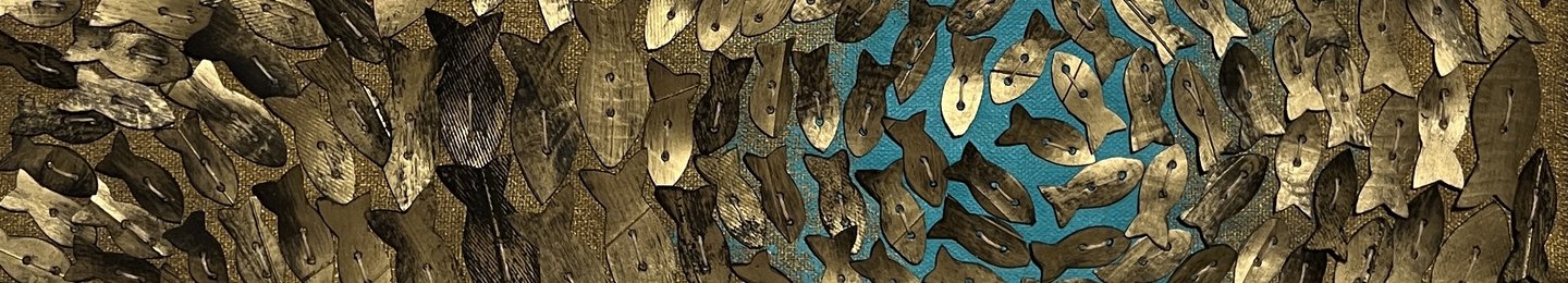 After a myriad of trials with different media, Claudia found the inner tubes of tyres to be the most adequate material to represent the fish shoals. She cuts thousands of fish with scissors and hand-stitches them to flax. The golden touch of the finished piece catches the light bringing to life the togetherness of the shoal.