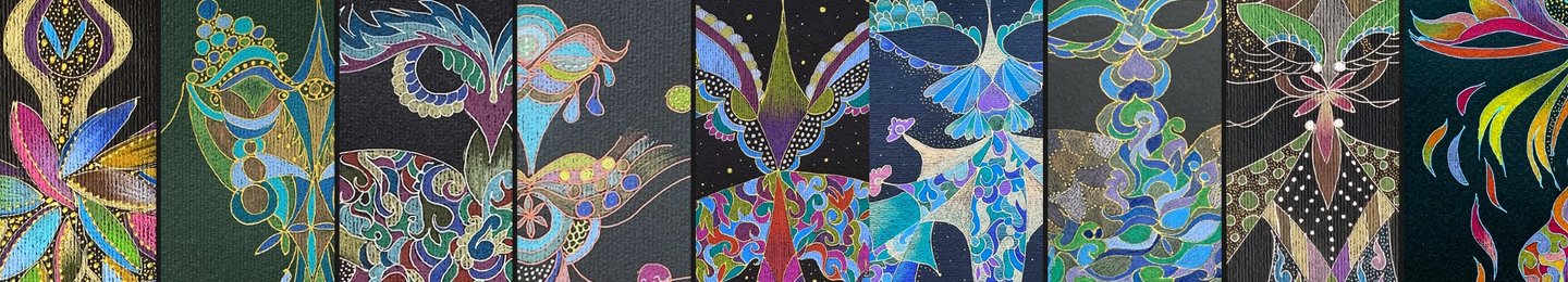 My style is distinguished by the creation of incredible Beings where rounded and closed lines resemble golden and silver arabesques or filigree. In my creations, you will see figures intertwining angels, eyes, flowers, hearts, and fish, among others, all floating in a borderless universe filled with energy. Each drawing takes into account the energy, frequency, and various dimensions these Beings inhabit, immersing you in the fantasy of details.