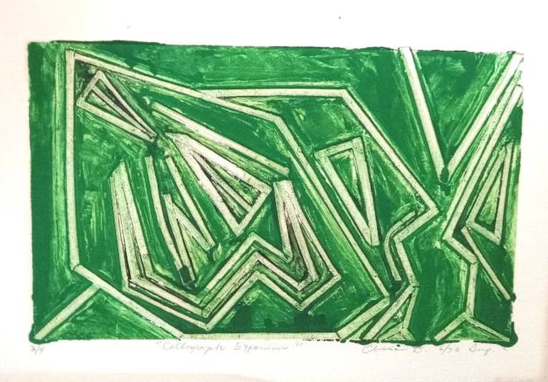 This captivating print, titled "Green Collograph Expansion", is a beautiful example of contemporary abstract art. Created in June 1976, this original collograph, impression number 2 of 4, showcases a unique blend of texture and form. The artist masterfully employs ink on paper to create an intriguin...