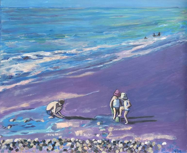 Acrylic + little parts of egg shells to make the stones of the beach. Children playing in the sand on a summer day. The light is playing on the water, the reflection of the sun is going on the little pad of water on the sand. I played mostly with the colors, the sun, the different lights and I reall...