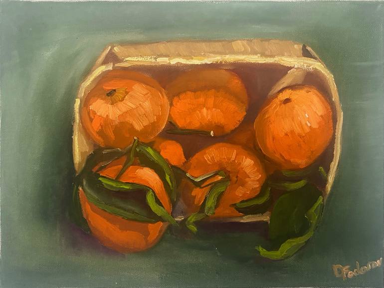The painting shows a still life with few tangerines in the wooden basket. Can be a good decor for the kitchen or a dinning room