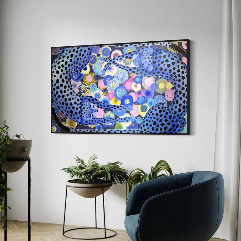 «Ultramarine» The size: 36 x 60 x 1 in Material: Acrylic Paints on Canvas The artwork is sold unframed Dreaming cheetah is in a field of flowers. My source of inspiration is the natural world, especially the depiction of wild animals, flora, and fauna. I portray nature, where plants and animals f...