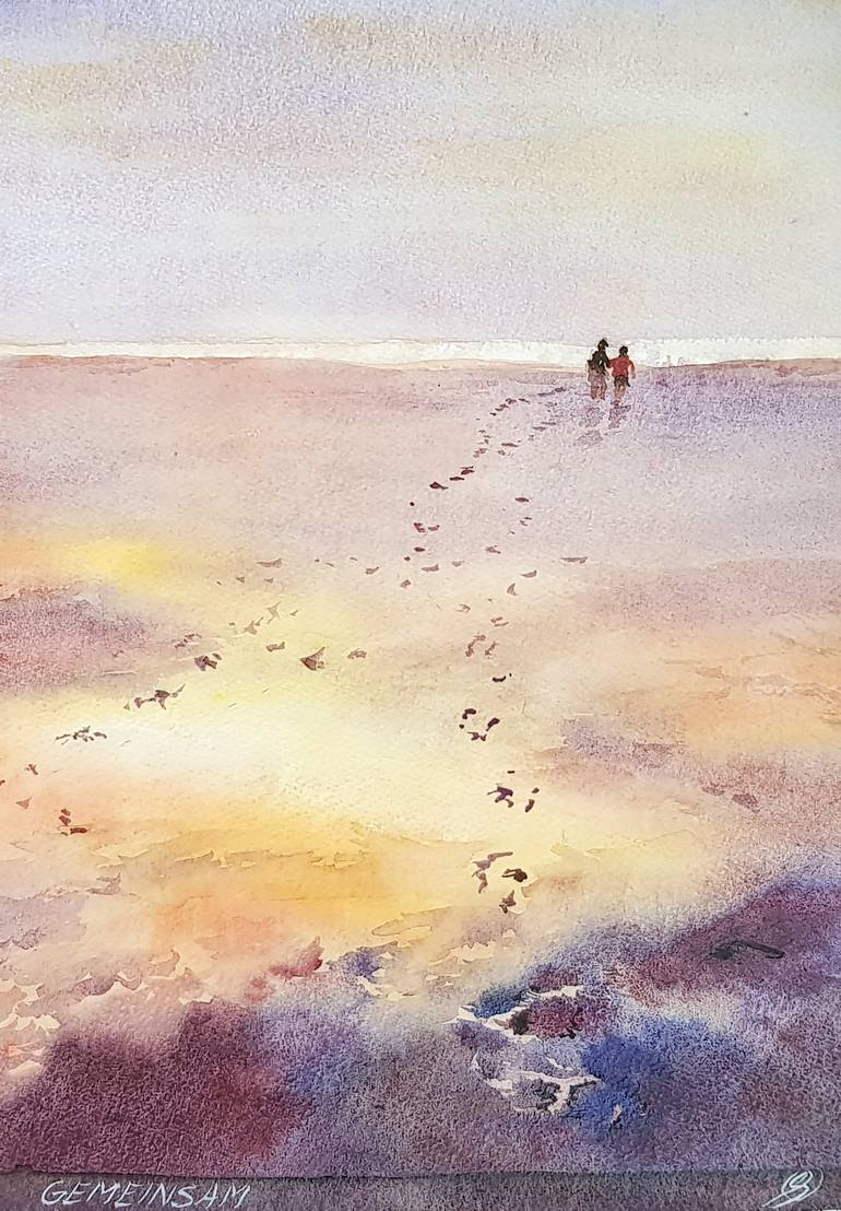 An old couple walking through the wadden sea holding each other. The foot steps show their path of life.