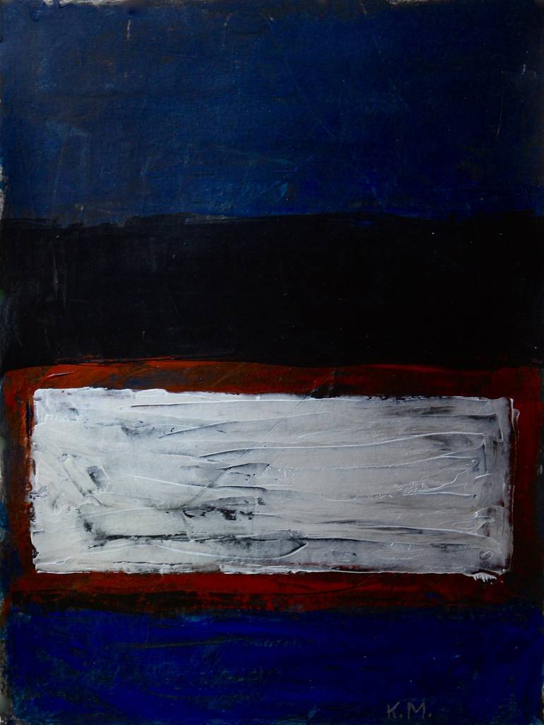 This is another of my Rothko-style inspirations. He did many dark paintings. This is very dark, darker than the photo. The silver metallic band in the lower half shines brightly while the dark red surrounding it is subtle, and black and navy make up the rest of the painting. size 18x24 inches 140L...