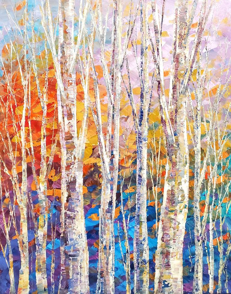Sunlight dances through the trees, illuminating fleeting moments. This is an original palette knife forest painting. Size: 22" x 28" x 1" Sides of the canvas are painted grey. You will receive it "ready to hang", with a wire attached on the back. Protective coat of satin varnish applied. The painti...
